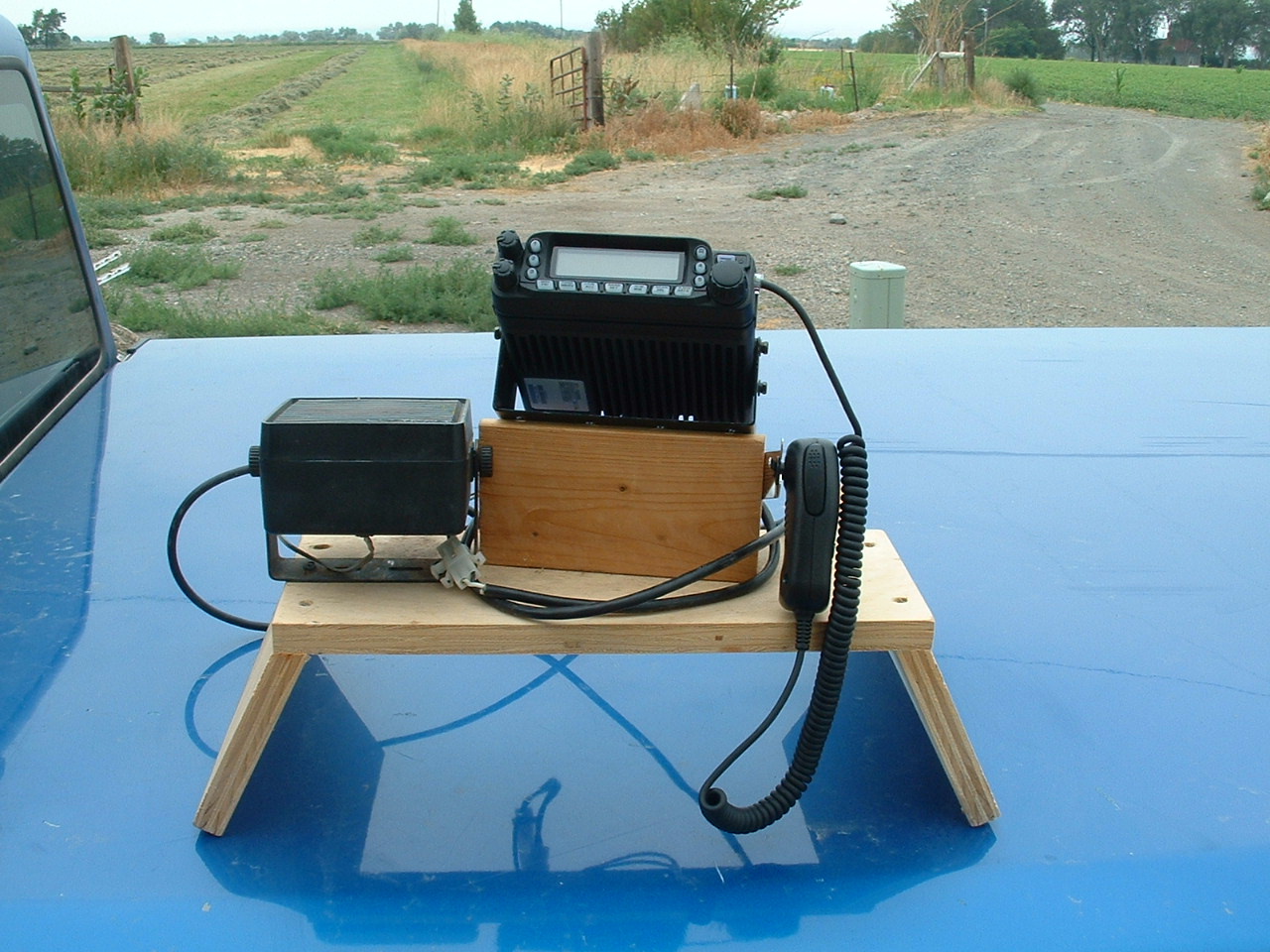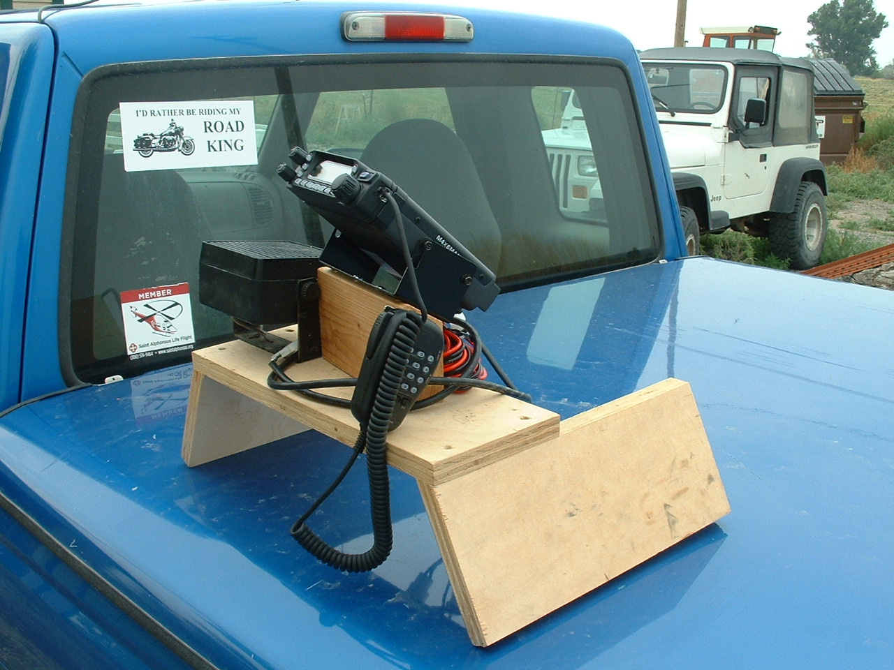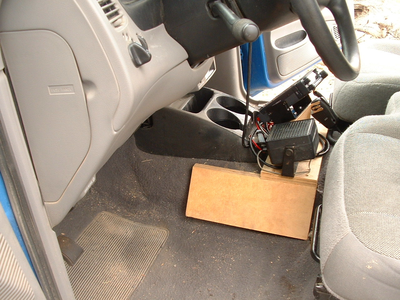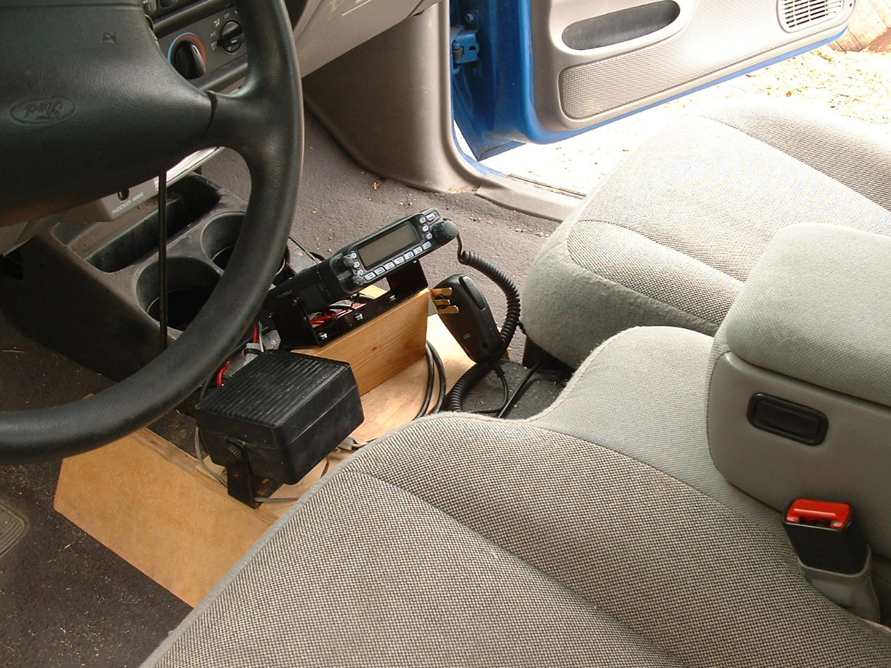 This is how I mount my Yaesu FT-7800 V/UHF radio in my 2000 Ford Ranger pickup. Now, depending on your particular vehicle, this setup may not work. But it works in mine and it works well. This allows me to have a full setup including radio, speaker and mic mount all on one unit. This way I don't have to drill any holes in the dash or floor. I also have a mag-mount antenna so I just route the RG-58 in through the back door of the pickup and under the seat up to the radio. I can unplug the cigarette-lighter plug and antenna and pull the entire unit out in about 15 seconds. Or about 30 seconds if I also take the antenna. The entire unit just sits on the "hump." There is no need for any screws or bolts to tie anything down. I see no reason why this same type setup wouldn't work with many of the smaller HF rigs such as the Yaesu FT-857 etc. I haven't painted mine yet but you could certainly do that and make it look much better. I have been using this for a couple of years and it works very well! This could be adapted for many other vehicles.